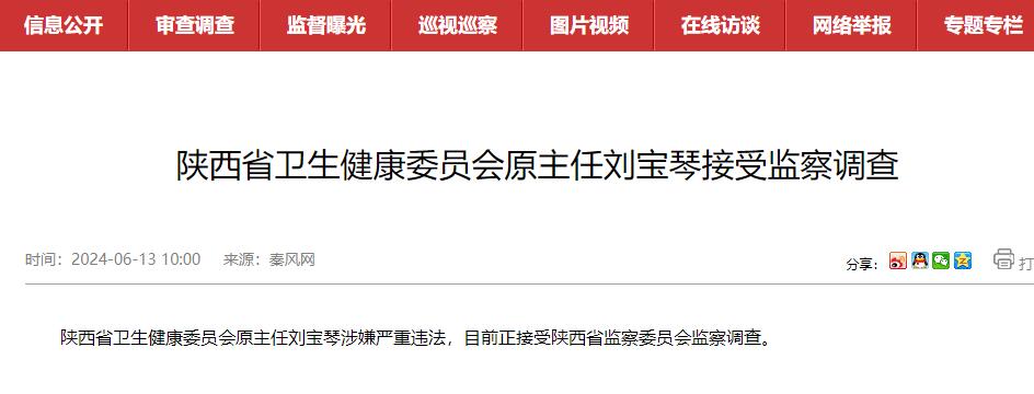 陕西省卫生健康委员会原主任刘宝琴涉嫌严重违法,目前正接受陕西省监察委员会监察调查。