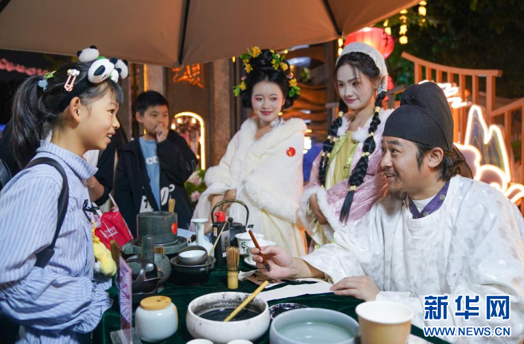 10月4日,在四川省成都市东门码头,夜游锦江项目推出的“锦夜庆华诞·璀璨耀蓉城”国庆系列主题活动上,“李白”(右)与小朋友互动对诗。新华社记者 胥冰洁 摄