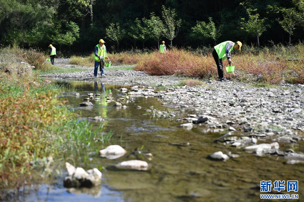 在安康市旬阳市吕河镇一处河道上,旬阳市守护汉江志愿者联合会的志愿者在捡拾垃圾(10月23日摄)。