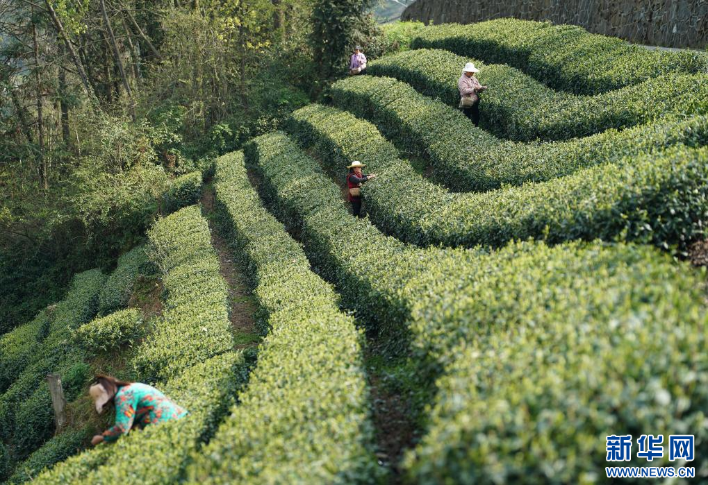 茶农在安康市汉滨区双龙镇一处茶山上采茶(3月27日摄)。