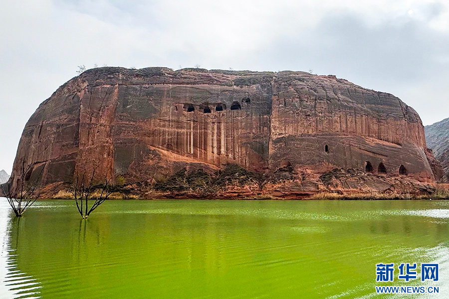 11月23日,依湖而立的水上丹霞宛如一颗朱红色宝石漂浮在绿色的水面上。新华网 杨喜龙 摄pagebreak