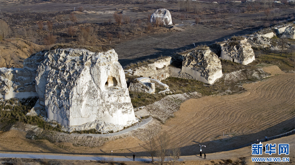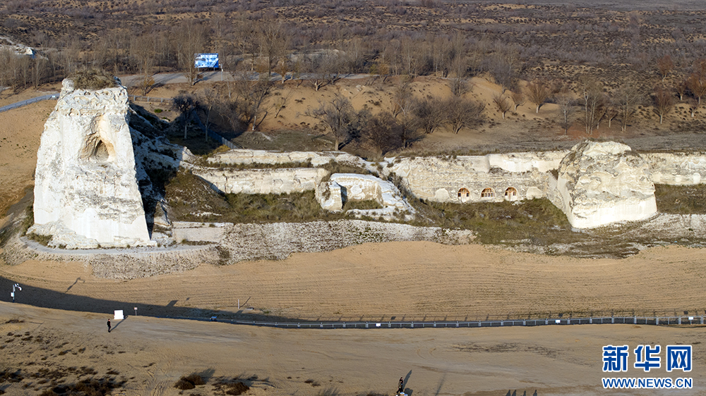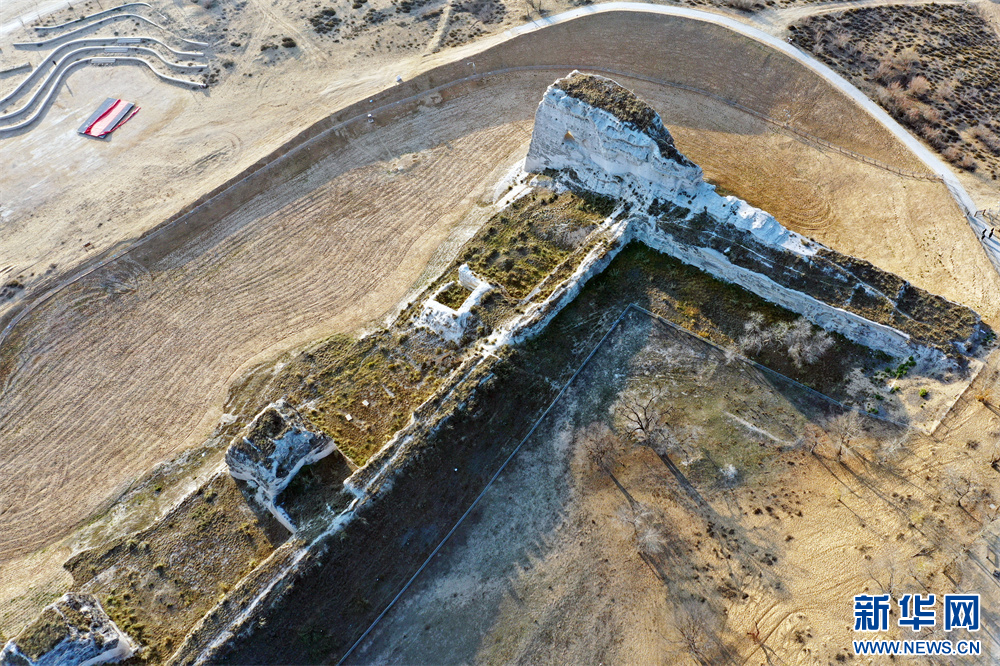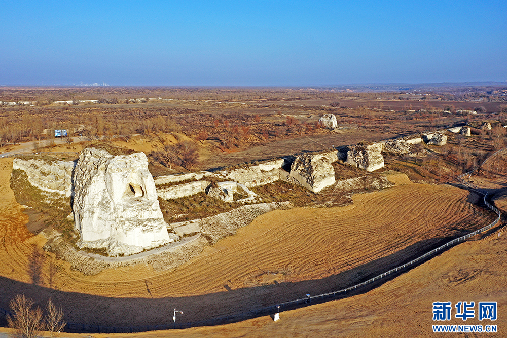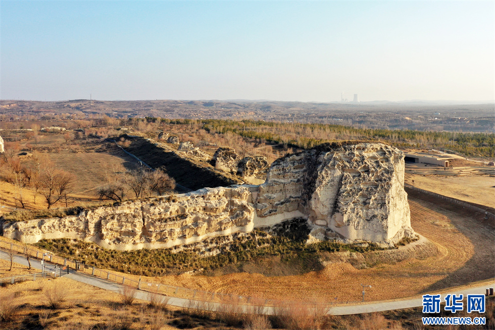 秋冬时节,走进统万城国家考古遗址公园,无人机视角下的遗址本体与戈壁、河谷、沙漠、黄土台垣等构成了独特的景观风貌。