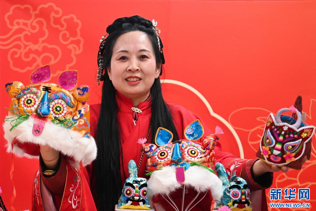 1月7日,澄城刺绣非遗传承人在陕西省文化馆举办的非遗年货集市上展示刺绣产品。
