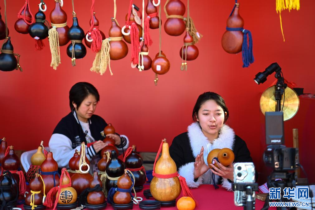 1月8日,传统酒葫芦工艺匠人在西安大唐芙蓉园内的非遗年货集市上直播带货。