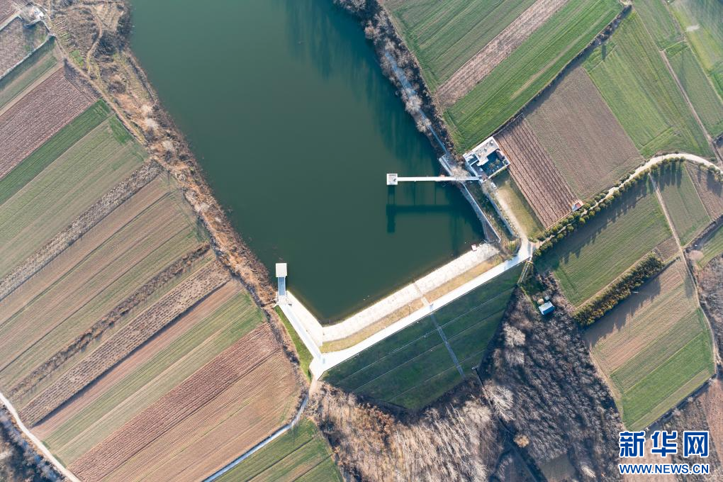 陕西省西安市长安区杨庄街道一处水库旁的麦田景色(1月7日摄,无人机照片)。
