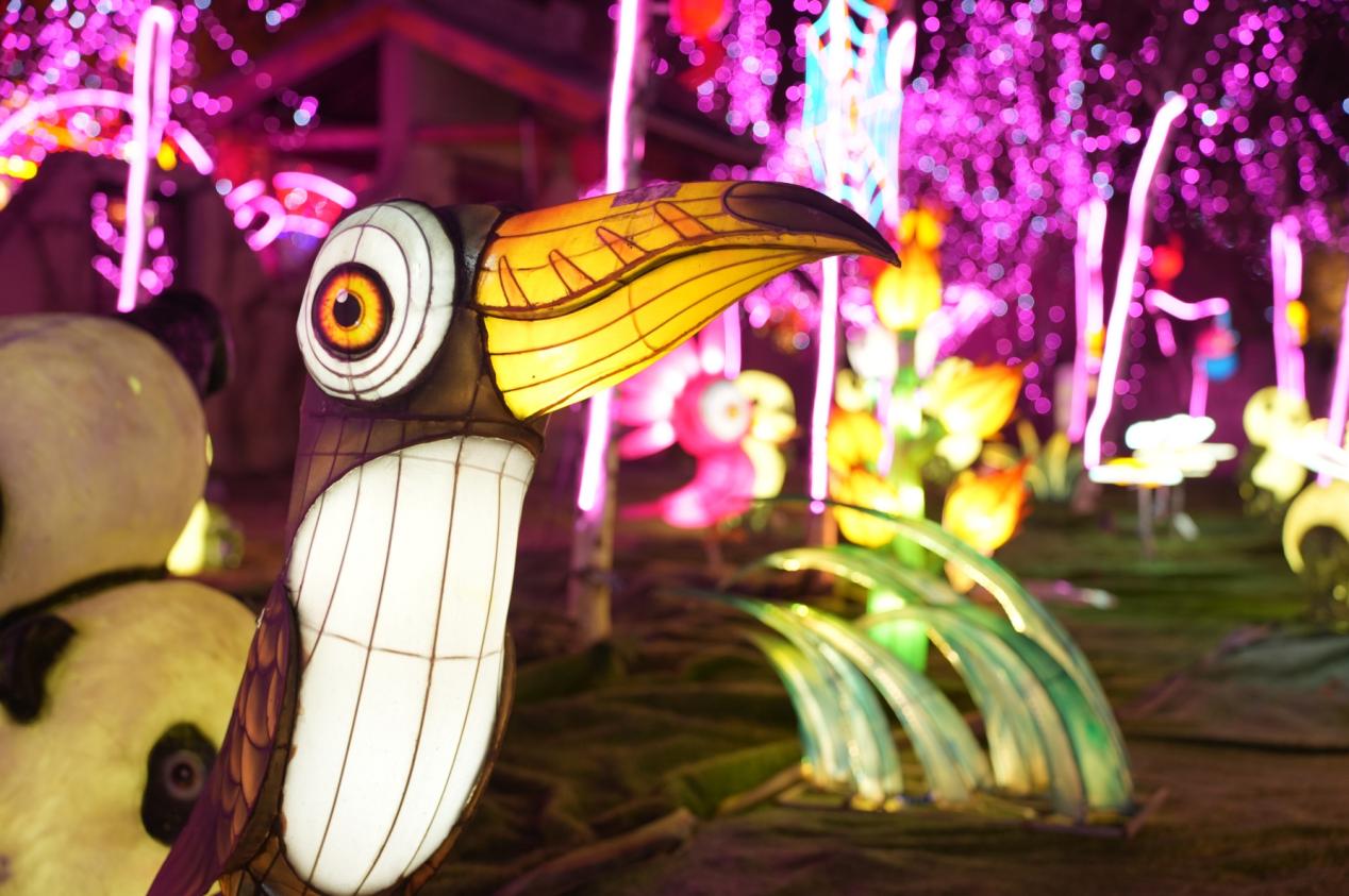 值得一提的是,灯会将《山海经》中,鲲鹏、貔貅、青龙等上古神兽形象与传统制灯手艺相结合,以内透光、轮廓追光、花朵闪动、鱼群追光、频闪灯等多种灯光效果,通过传统与现代技术的完美结合,让游客沉浸在童话世界中。