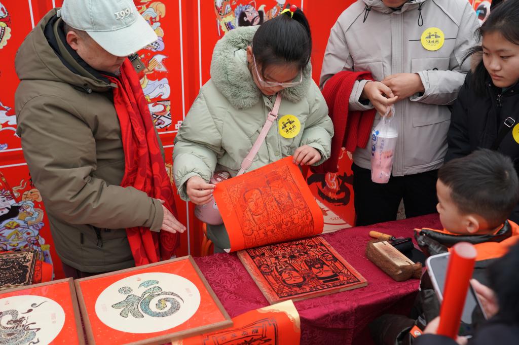 活动现场先后举办乙巳年新春祈福礼、乙巳年新春宴飨礼两项活动,庆祝蛇年新春。此外,面花面塑、木版年画、窗花剪纸、传统茶戏、威风锣鼓等多种充满年味的非遗展演和互动体验活动,2月1日起在景区内开展。不少家长带领小朋友在活动现场尝试印制木版年画、制作瓦当拓印。