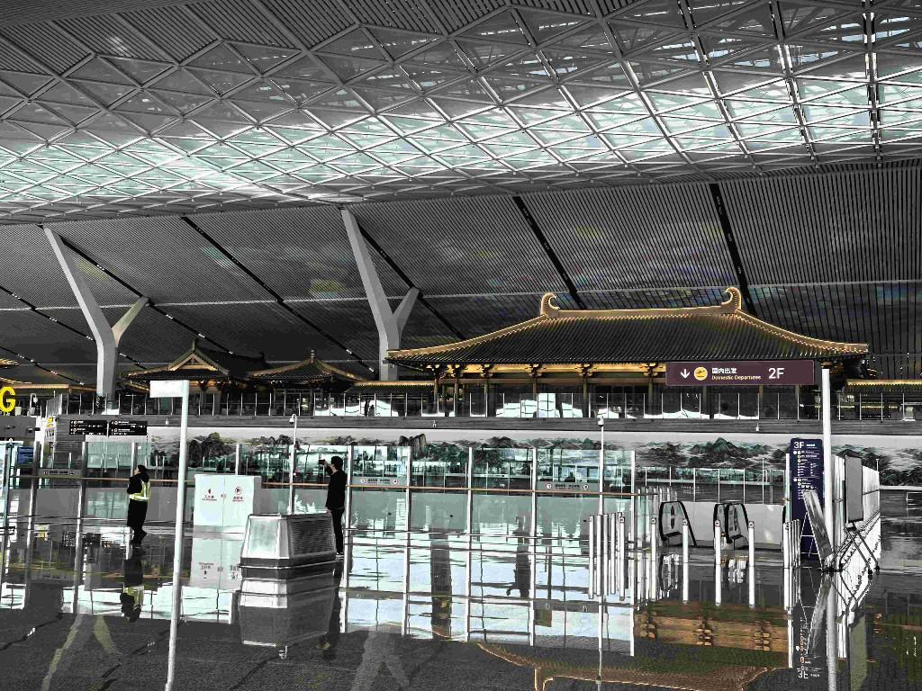 车站公共区装修与机场航站楼装修风格协调统一,结合14号线“武士铠甲”设计元素,从使用功能、安全可靠等方面综合研究,形成以天空云海为概念,提取曲线、纹理元素,通过装饰手法与造型灯具结合,营造现代的空间氛围。站徽以飞机跃飞姿态为设计主题,既彰显了陕西腾飞发展态势,又体现了站域功能特征。