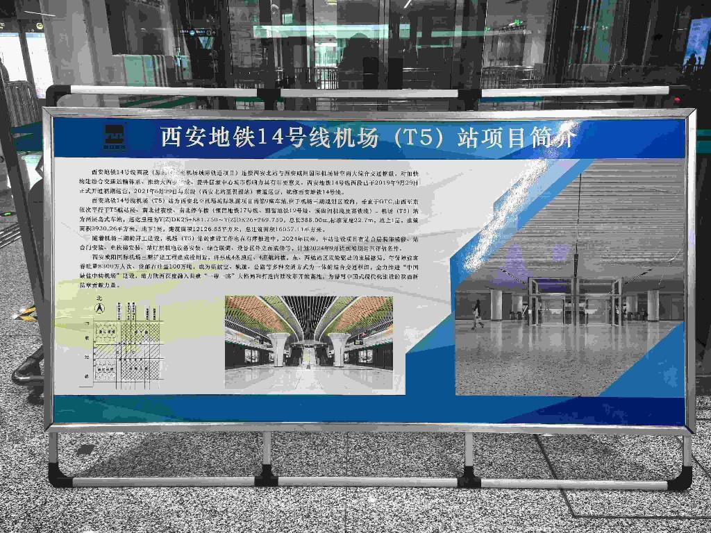 机场(T5)站位于西安咸阳机场T5航站楼东侧,机场过夜用房与停车楼之间,沿航站楼南北向与交通中心(GTC)正交布置,为两层岛式车站,总建筑面积16057.11平方米。车站站厅位于GTC首层换乘大厅内,站台位于地下一层。车站的建成投用,实现地铁与航空等多种交通方式的零距离换乘,有效提高市民群众和外地旅客的出行便捷程度。