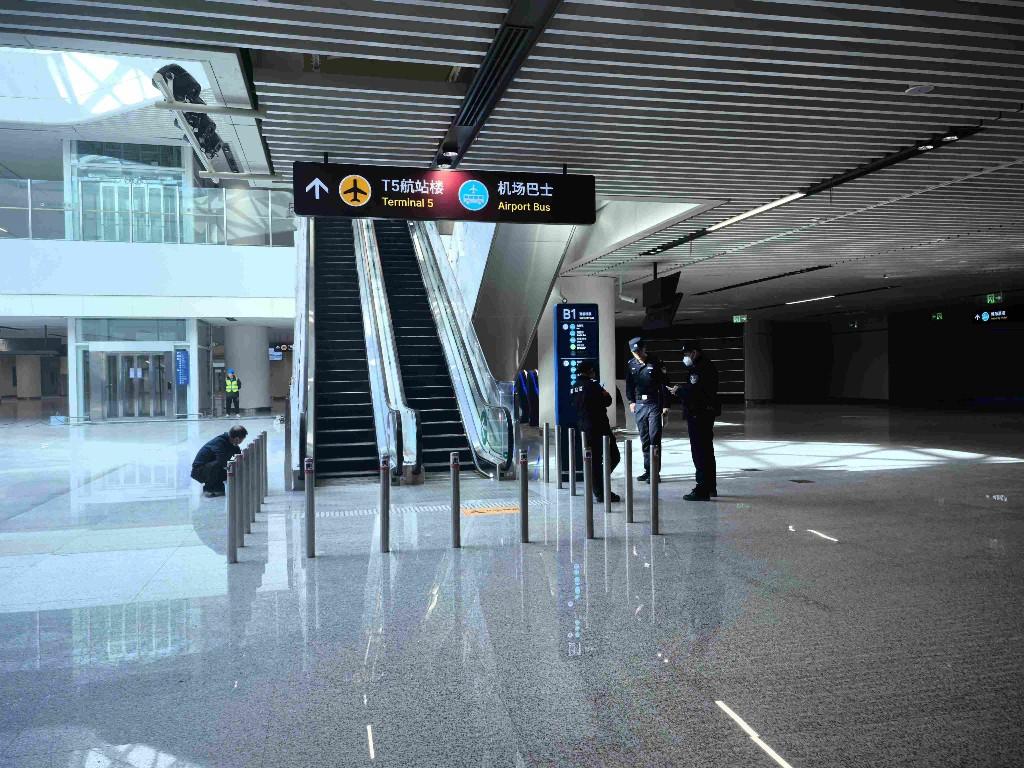 地铁前往T5航站楼出发层:乘坐地铁14号线到达机场(T5)站下车,从站台通过扶梯(或直梯)到达站厅,经出站闸机出站,向西到达停车场或乘坐扶梯到达航站楼二、三楼出发层大厅值机。