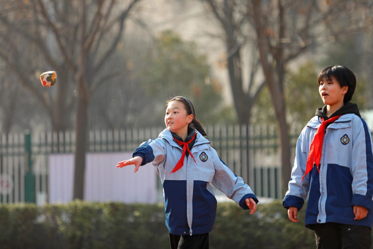 2025年2月27日,陕西省渭南市临渭区丰荫明德小学,小学生在课间活动中玩丢沙包游戏。崔正博 摄
