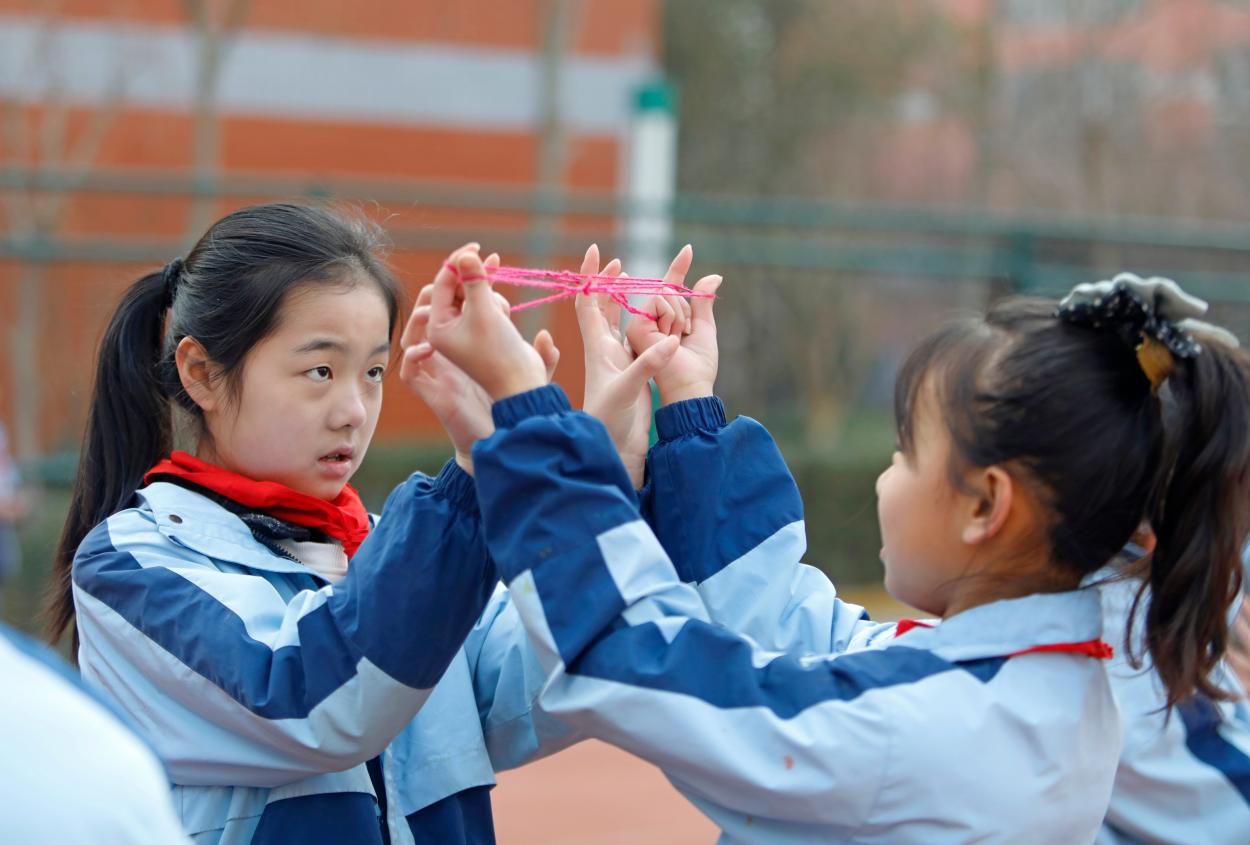 2025年2月27日,陕西省渭南市临渭区丰荫明德小学,小学生在课间活动中玩翻花绳游戏。崔正博 摄