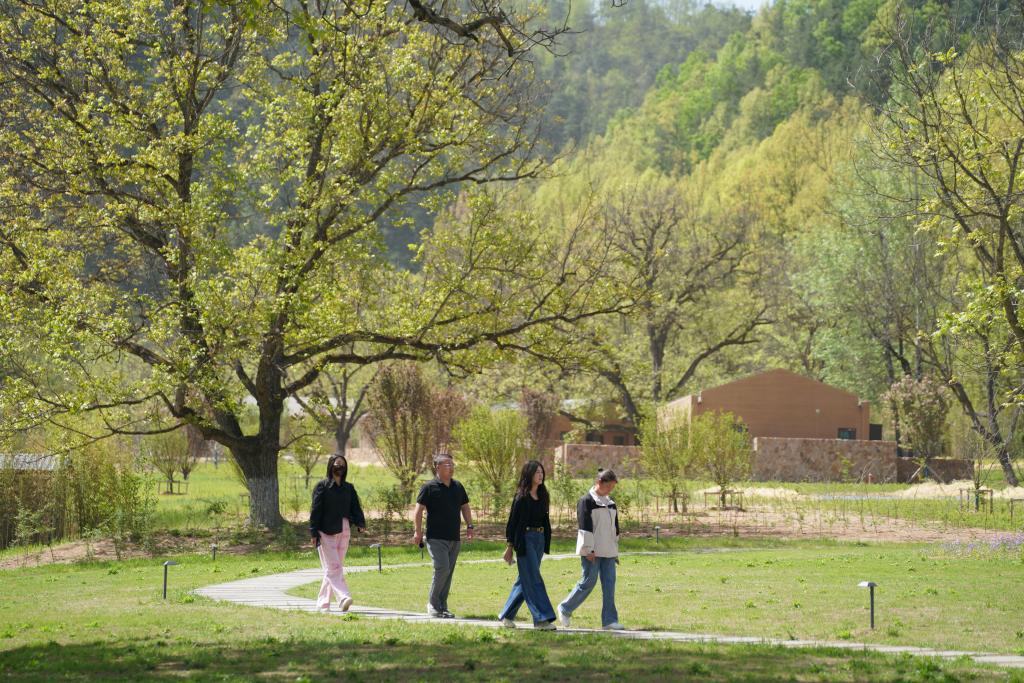 4月23日,游客在洛南县核桃树主题景区桃悠谷游览。新华社记者 邵瑞 摄