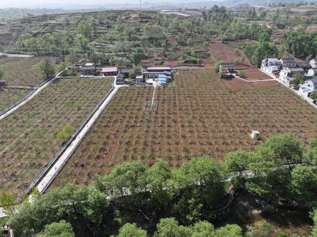 洛南县景村镇八一村发展的红仁核桃基地(4月23日摄,无人机照片)。新华社记者 邵瑞 摄