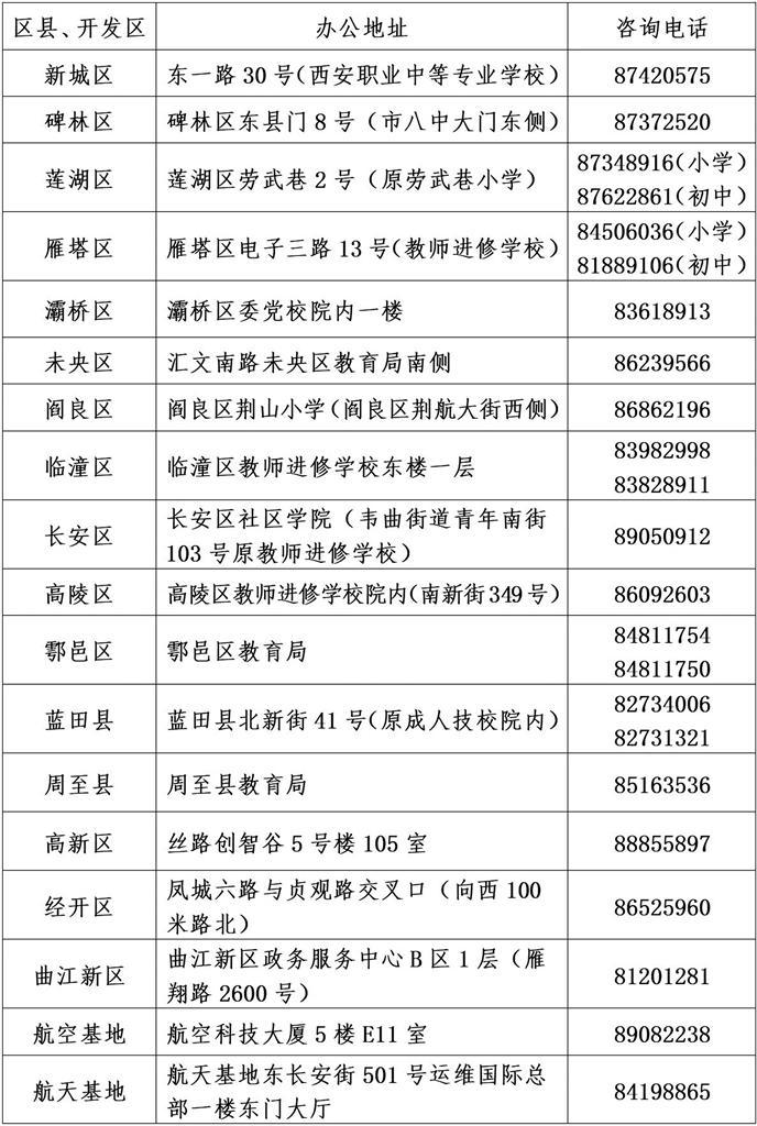 各区县(开发区)招生入学接待协调中心办公地址及咨询电话