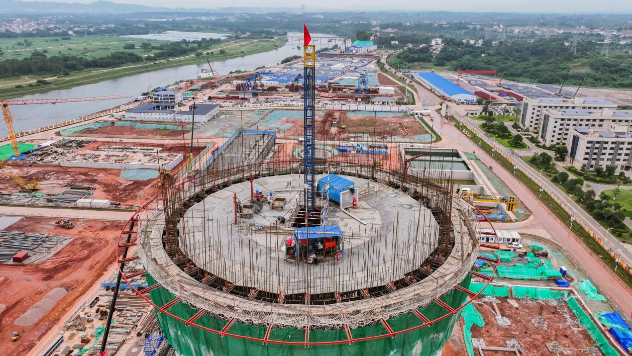 施工现场,1#、2#冷却塔拔地而起,锅炉钢架有序吊装。1600余名建设者、百余台设备抢抓工期。目前主厂房地下设施完工,锅炉钢架吊装、冷却塔主体结构、电除尘基础等关键节点按计划推进。