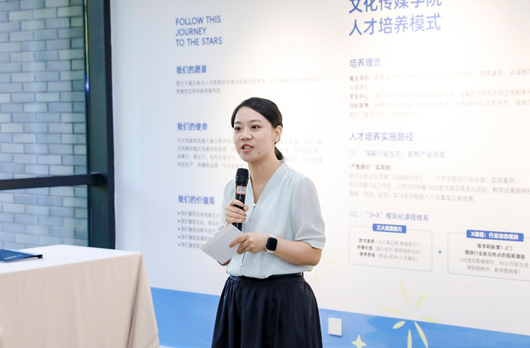 在发布会上,西安欧亚学院文化传媒学院院长助理彭欣做《ESC传媒教育创新模式路径探索》主题分享。