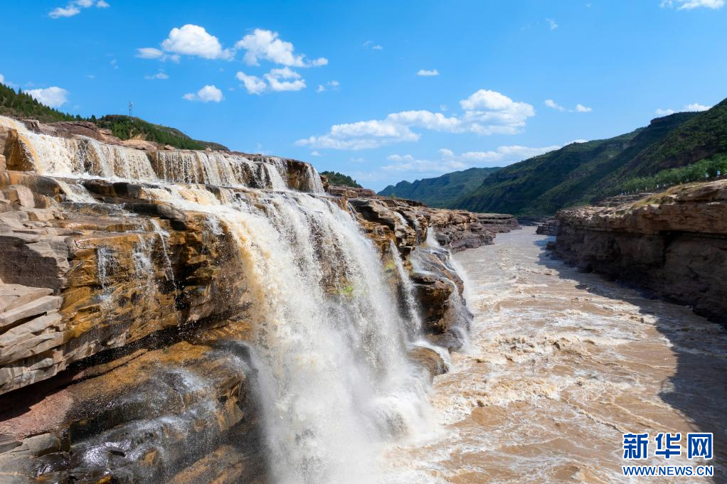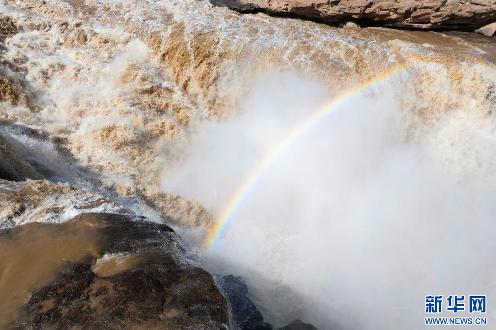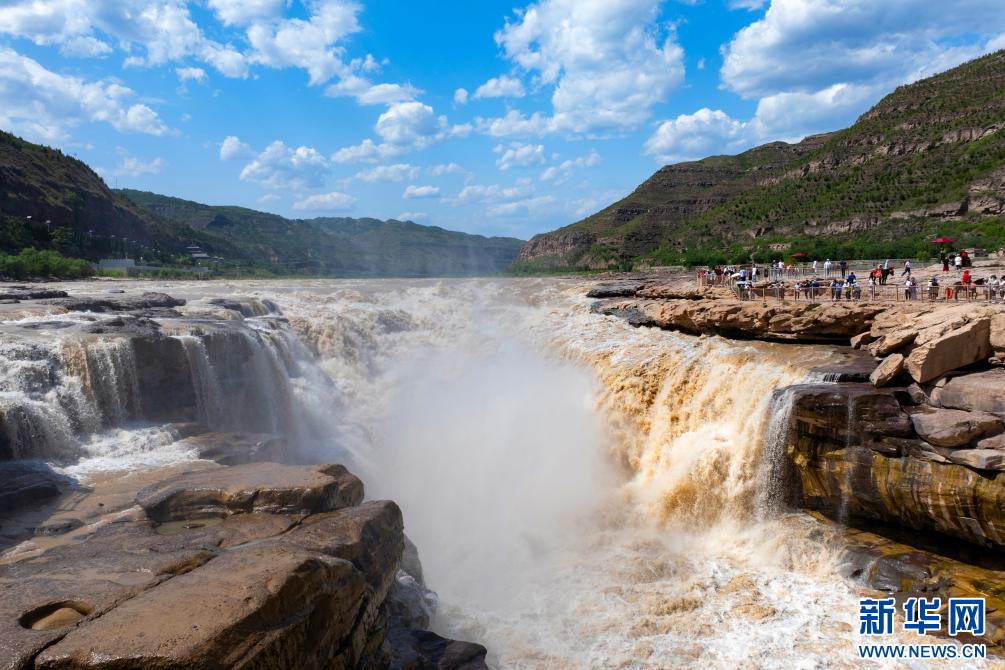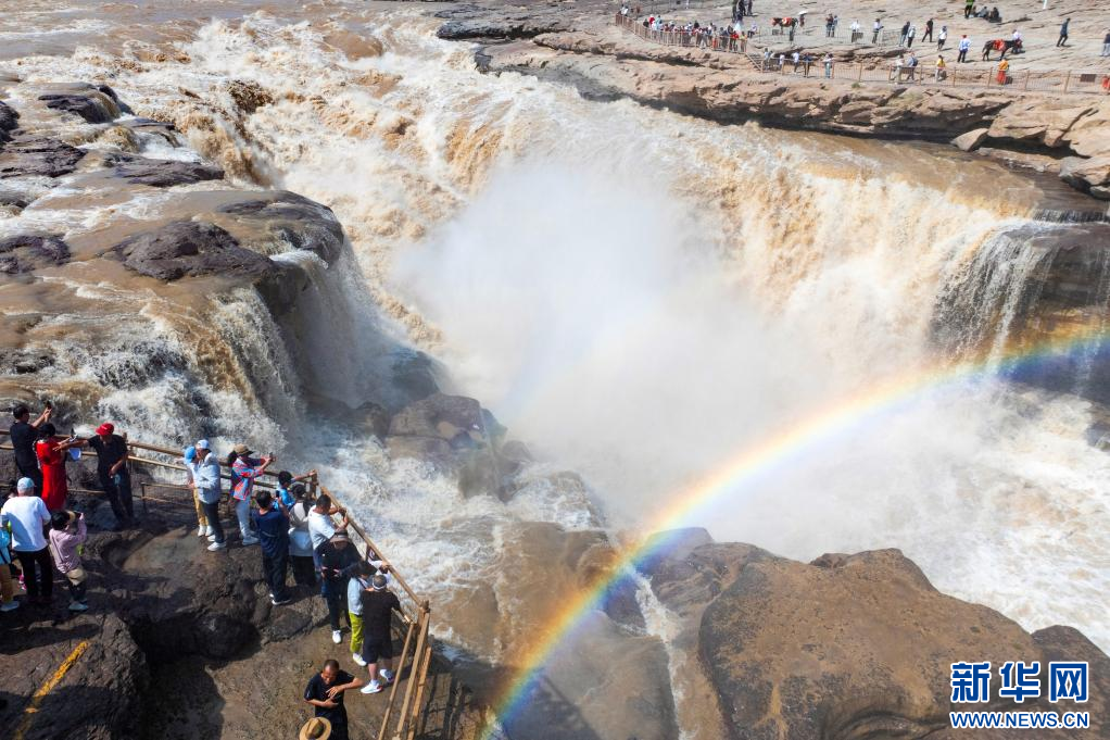 近日,受降雨影响,黄河壶口瀑布由清变黄,奔腾的河水裹挟着泥沙倾泻而下,形成“黄瀑碧空”的美景,吸引游客纷至沓来。(王智超 霍勇 宋洋波)