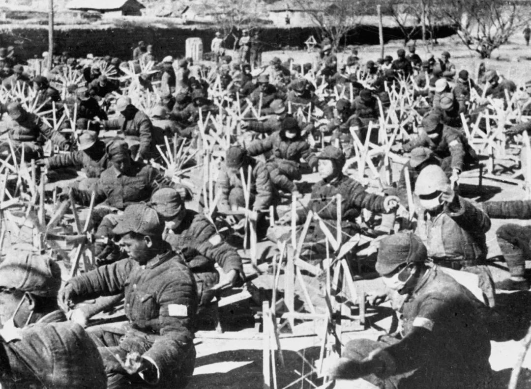这是八路军战士坐在纺纱车前纺纱。新华社发(资料照片)