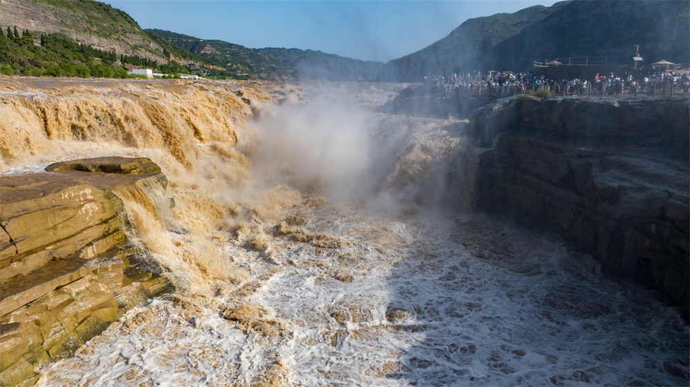 奔腾的黄河壶口瀑布吸引众多游客前来观赏。