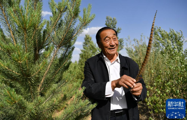 石光银在自己治理的林子里捡到一根野鸡翎(2020年5月30日摄)。新华社记者刘潇摄