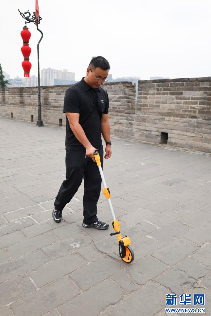 9月10日,一名文保巡查员在西安城墙上测量瓮城东踏步墙体裂缝宽度。