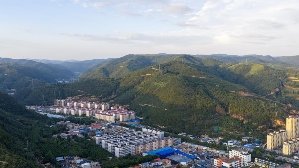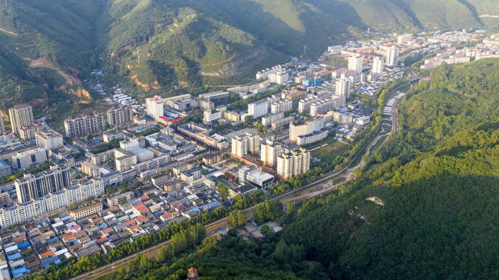 9月16日,一场秋雨过后,陕西省延安市黄龙县天空放晴,晚霞如约而至。随着无人机缓缓升空,独特的高空视角下,群山仿佛被洗涤过一般,山脚下的城区错落分布,与斑斓晚霞交相辉映。