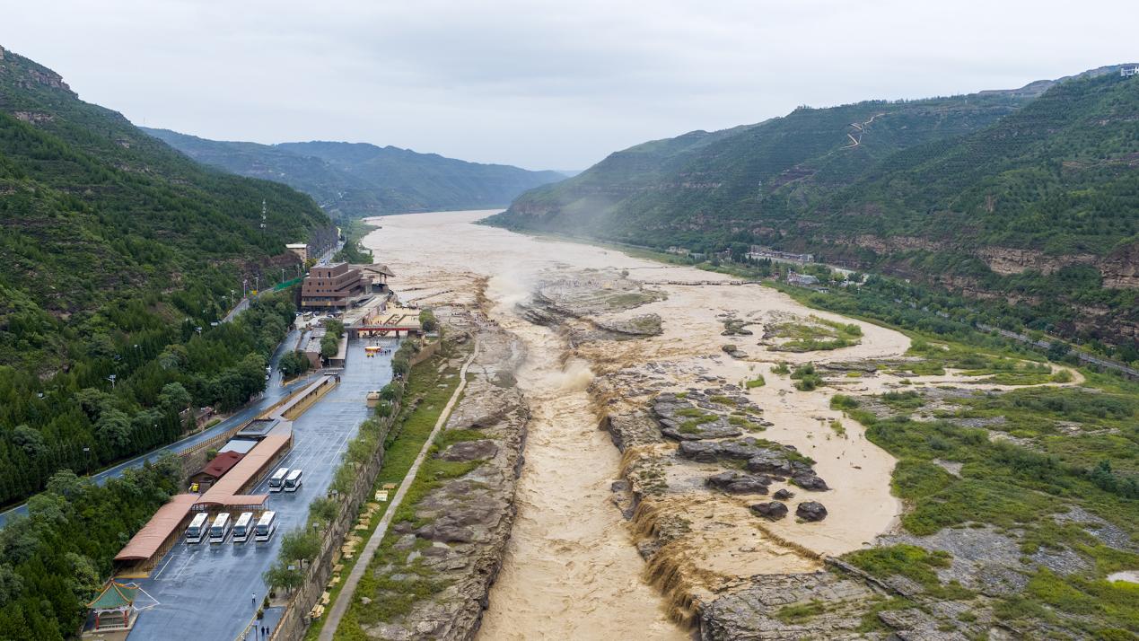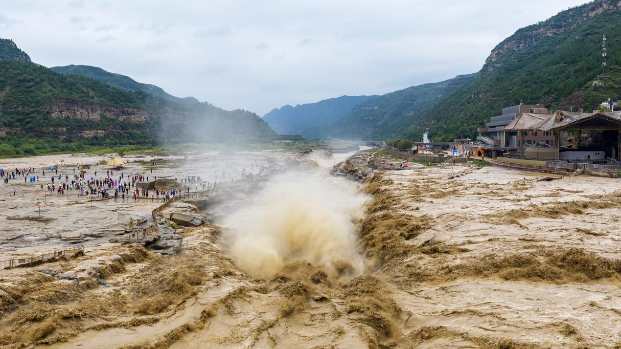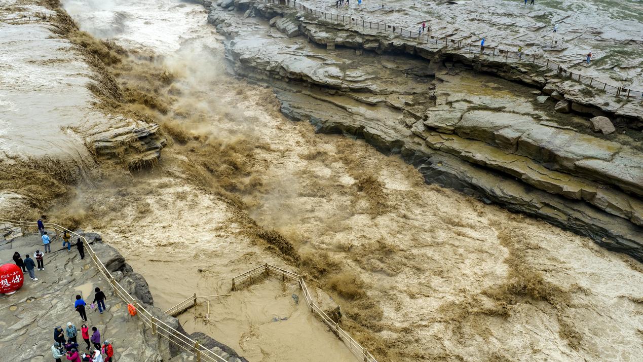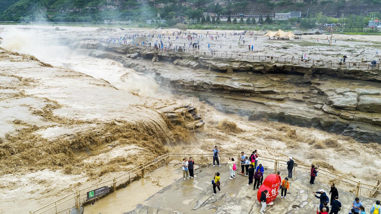 9月17日,陕西宜川壶口瀑布在约1500立方米每秒的水流量下,水流湍急,激起巨大水雾,展现雄浑气势。pagebreak