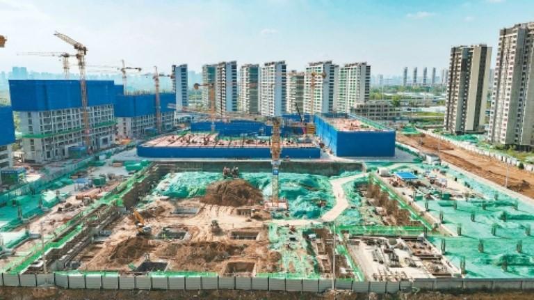 而在20公里外的西安市浐灞国际港右岸高中项目建设工地,秋雨并未阻挡施工进度,工人们正在为主体结构封顶做最后的冲刺……