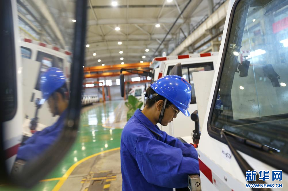 在陕西建设机械股份有限公司装配车间,工人正在进行矿用防爆锂离子蓄电池无轨胶轮车的生产工作。新华网 王智超摄pagebreak
