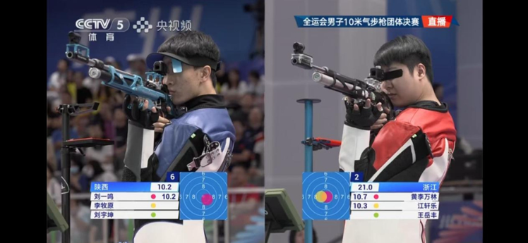 10月15日,第十五届全国运动会男子10米气步枪团体决赛在广东省广州市举行。由刘宇坤、李牧原、刘一鸣三人组成的陕西队对阵浙江队。
