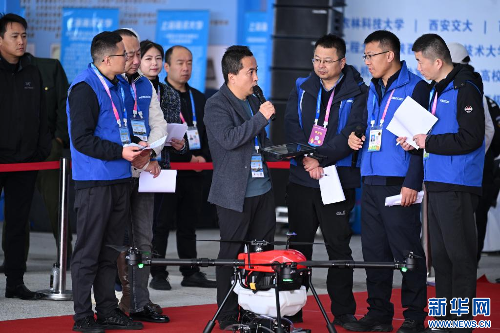 10月26日,在第32届杨凌农高会的农业机器人比赛上,陕西华基枫林科技有限公司的技术人员(前中)向评委介绍参赛的农用无人机产品。新华社记者 李一博 摄
