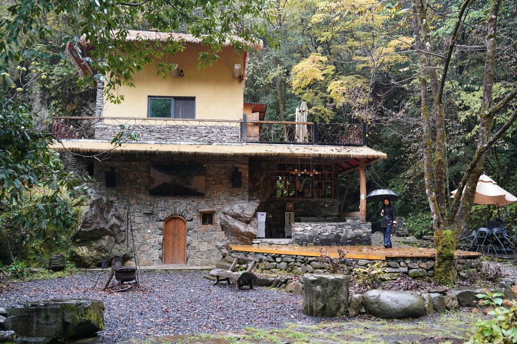 10月29日,在镇坪县牛头店镇国庆村,一家山居酒店工作人员在酒店书吧内打扫卫生。
