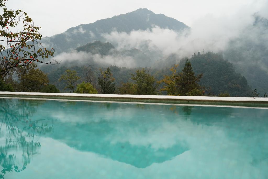 镇坪县牛头店镇国庆村一家山居酒店的泳池与周边景色(10月29日摄)。