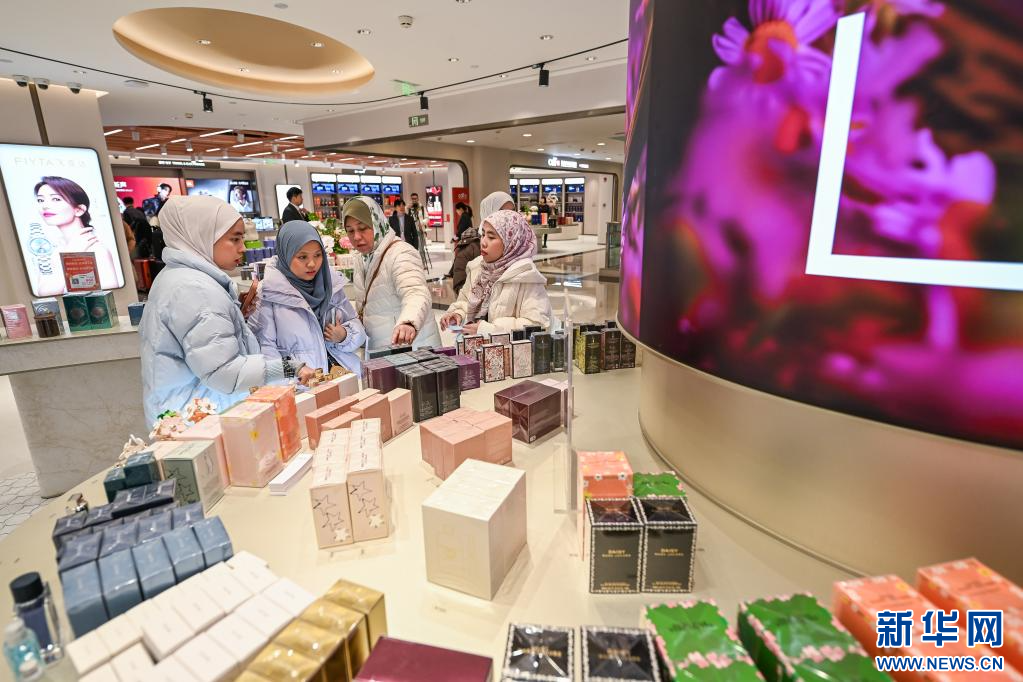 11月26日,来自马来西亚的游客在西安市内免税店免税商品区选购香水。
