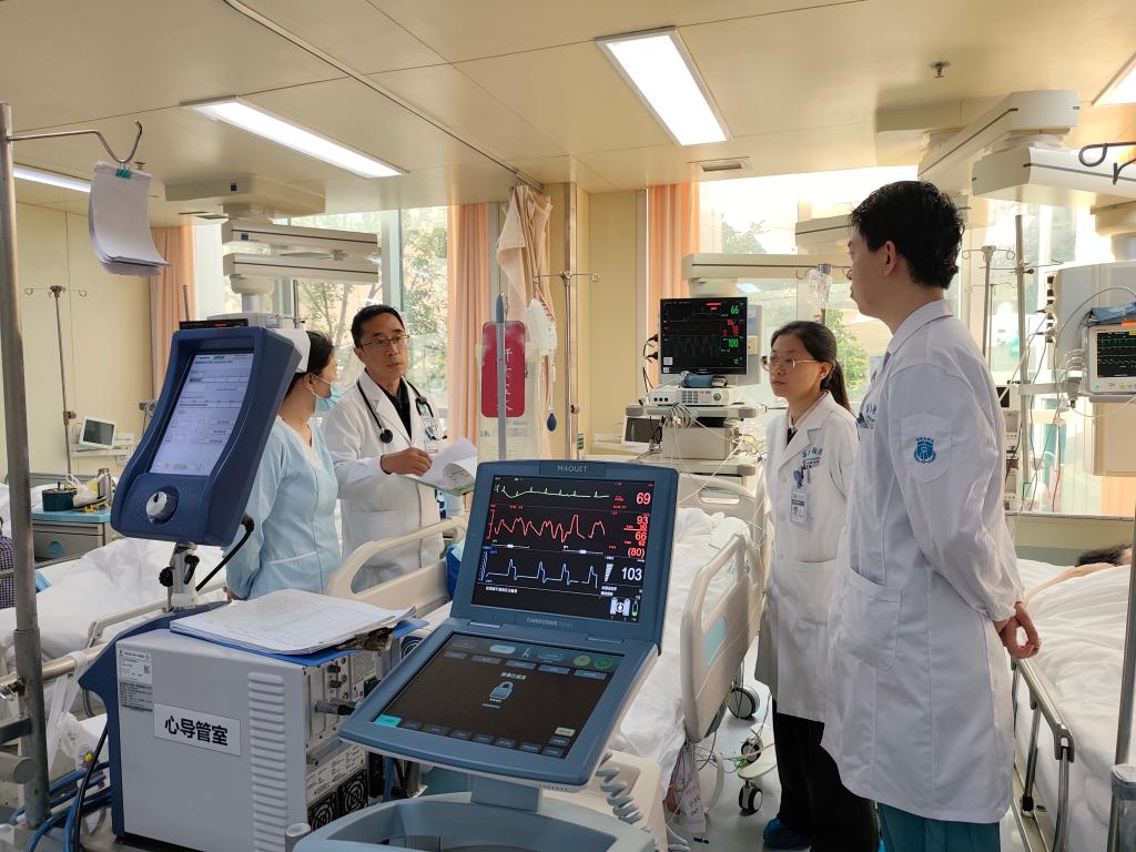 空军军医大学西京医院心血管内科主任医师李飞(左二)与团队进行术后查房。 新华社发