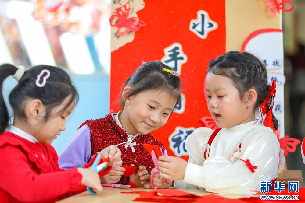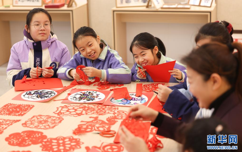 12月30日,河北省石家庄市天苑小学学生在非遗剪纸课堂上学习剪纸技艺。