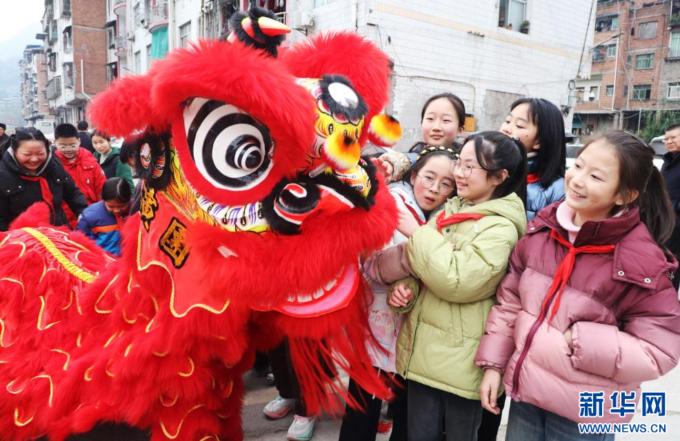 12月26日,在四川省宣汉县黄金镇中心校,宣汉县黄金狮舞团为学生们表演舞狮。