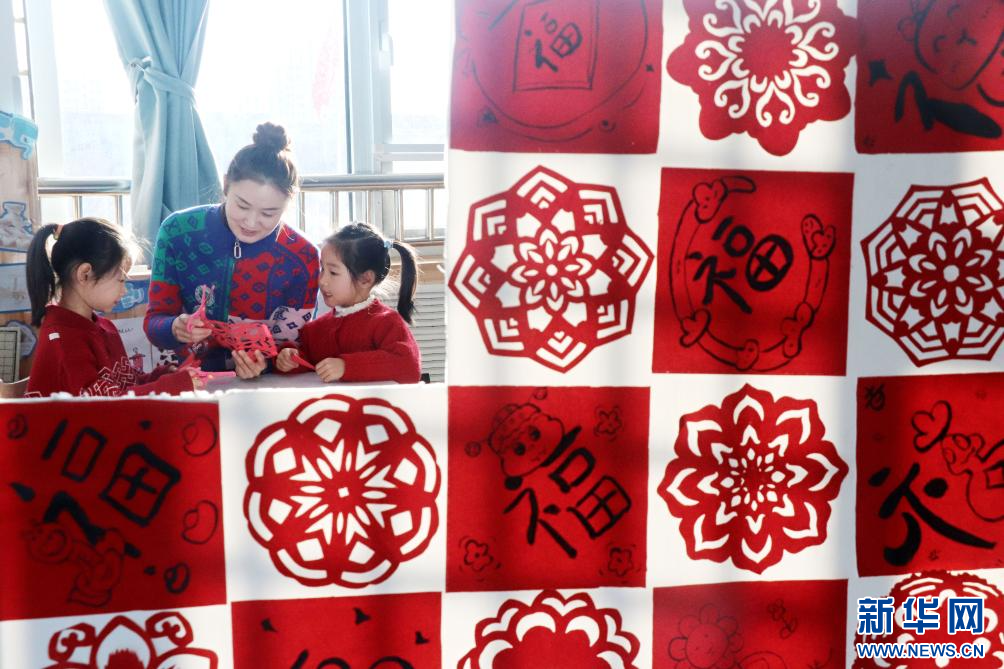12月30日,在河南省武陟县第一幼儿园,老师和小朋友制作新年剪纸。