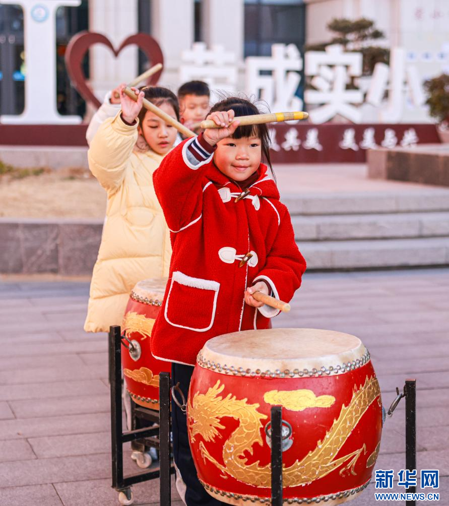12月26日,在山东省荣成市实验小学校园内,孩子们练习渔家锣鼓,为迎新年文艺汇演做准备。