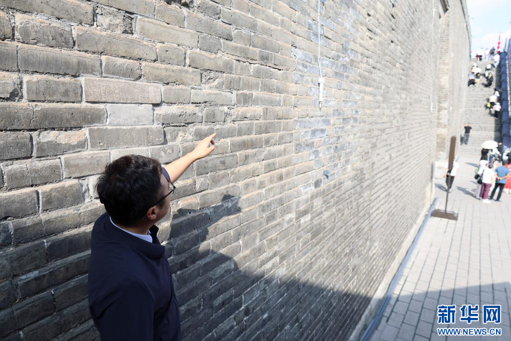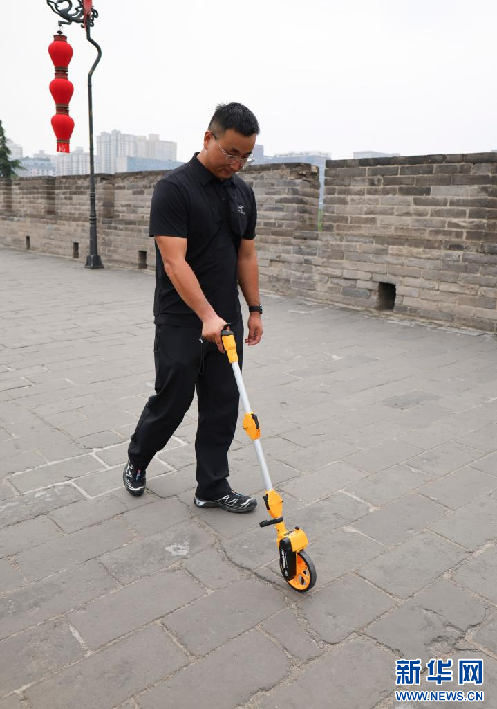 文保巡查员在西安城墙上测量海墁裂缝长度(2025年9月10日摄)。