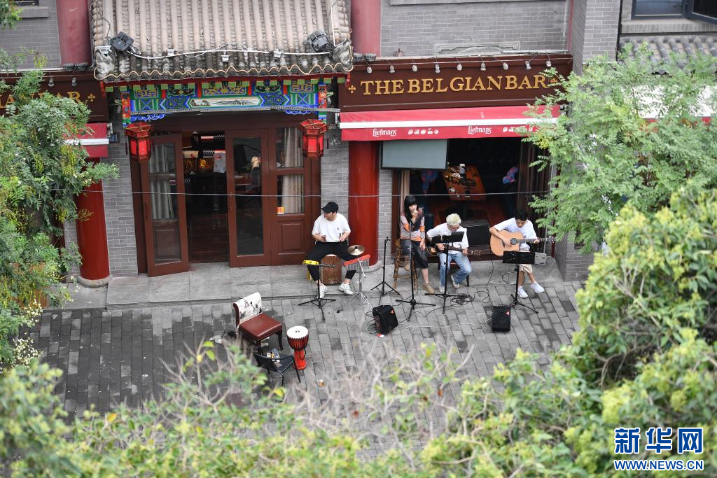 在西安城墙内侧顺城巷边的一家小店外,一支乐队在排练(2025年9月10日摄)。