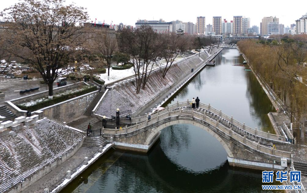 西安城墙东南角下的护城河(无人机照片,1月20日摄)。