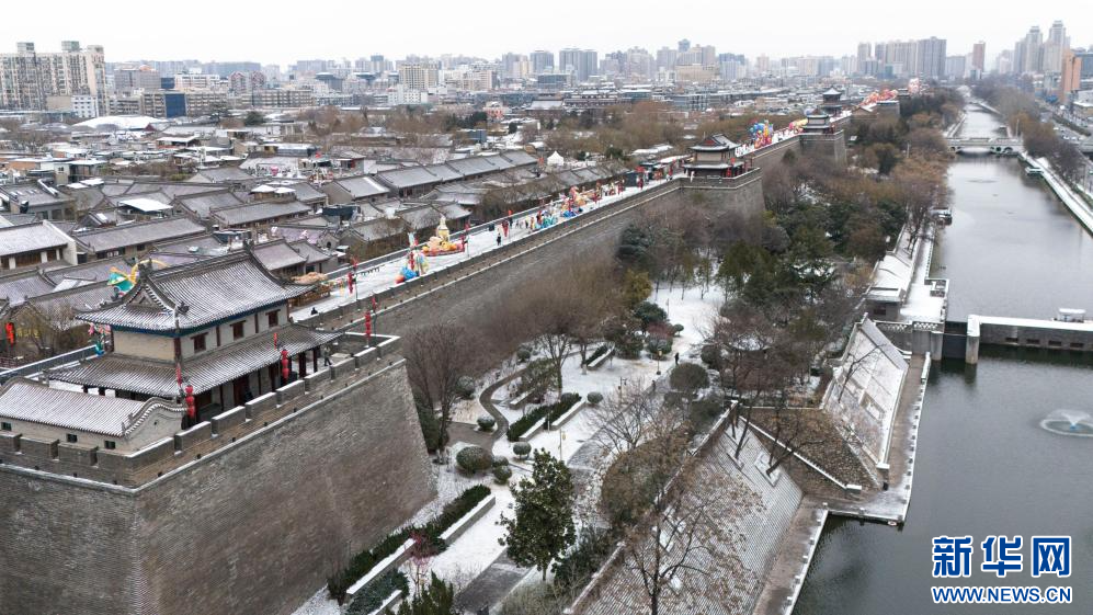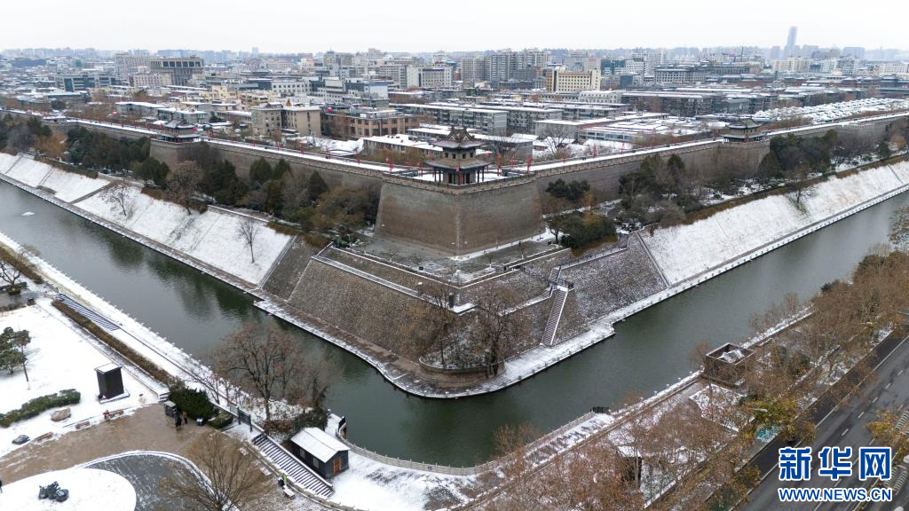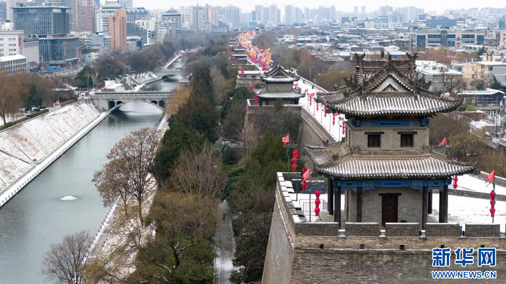 西安城墙东南角及护城河(无人机照片,1月20日摄)。