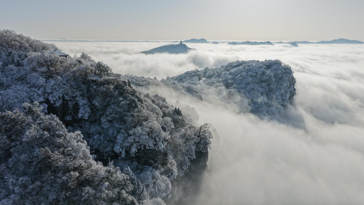 1月23日,汉中龙头山雪后初霁,云海雾凇惊艳同框。(宋晓丽 摄)