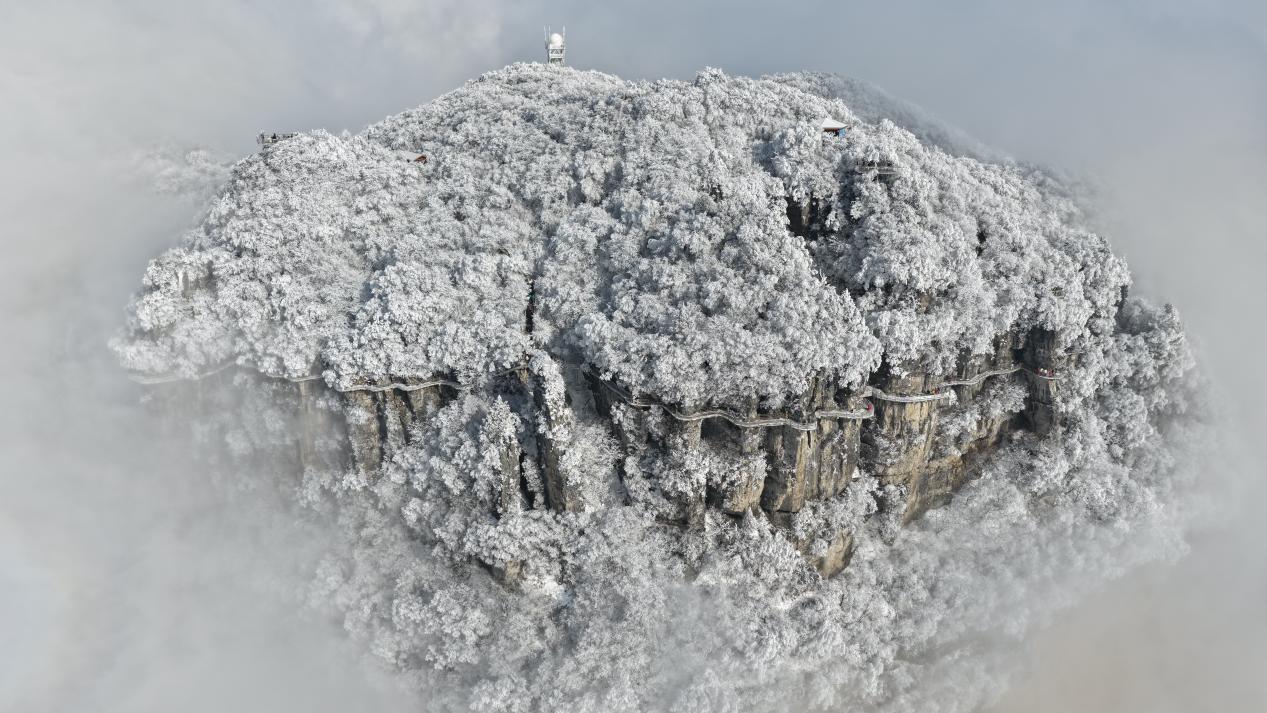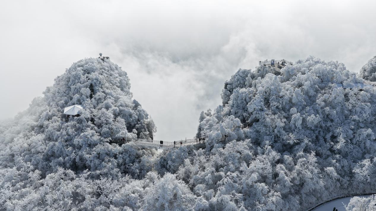1月23日,汉中龙头山悬空栈道犹如一条巨龙横梗于山间,游客漫步其中,近距离感受高山冰雪与云海交织的壮美景色。(宋晓丽 摄)pagebreak
