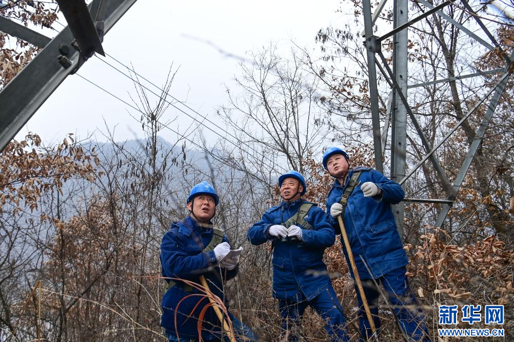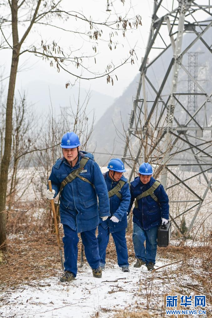 1月29日,国网宝鸡供电公司输电运检中心秦岭输电运维班班长周红亮(前)、副班长令云(中)、副班长薛龙在宝鸡市凤县黄牛铺镇东河桥村附近进行线路覆冰巡检。新华社记者 邹竞一 摄pagebreak