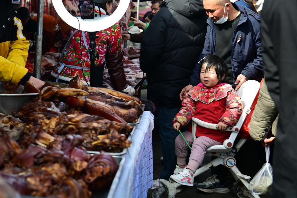 2月13日,游客在焦岱大集上选购特色食品。
