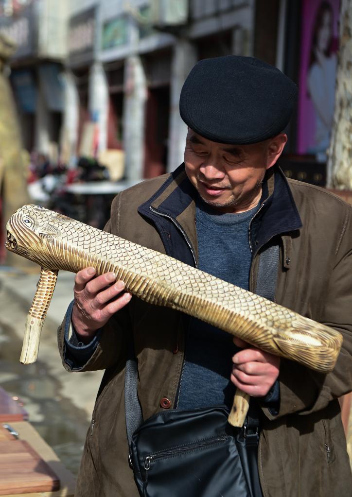 2月13日,当地手工艺人李学员在焦岱大集上查看自制的手工凳子。