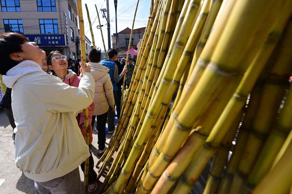 2月13日,游客在焦岱大集上选购甘蔗。